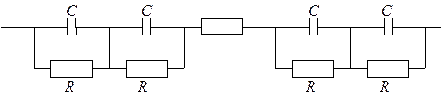 где Оптические исследования показывают, что время применения отражательной способности ячейки при подаче на нее импульсного напряжения и освещении светом длиной волны l = 504 нм, имеет тот же порядок, что и время зарядки конденсатора. При подаче const напряжения на ячейку в ней течет ток, под действием которого частицы магнетита двигаются к электродам, образуя вблизи поверхностей проводящий слой, отделенный слоем ПАВ. В объеме ячейки образуется объемный заряд, который обуславливает проводимость ячейки. Предполагается, что можно рассматривать ячейку как систему последовательно соединенных конденсаторов, обкладки которых представляют собой проводящий слой диоксида олова, слой проводящих частиц с непроводящим слоем ПАВ, проводящую среду, обусловленную возникновением объемного заряда. Эквивалентная схема ячейки: