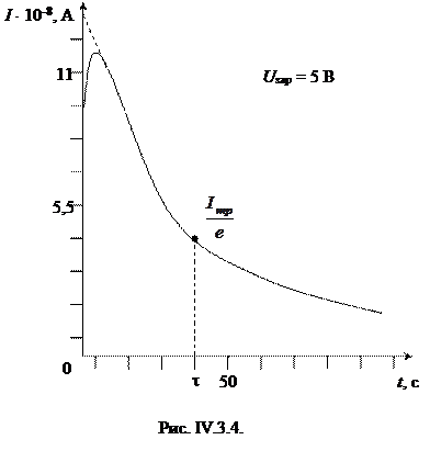 К электродам КЯ сносятся магнитные частицы следующими механизмами переноса: кулоновскими силами напрямую и кулоновскими силами опосредованно через внутреннее трение. В этом заключается смысл электрофореза. Благодаря очень малой подвижности магнитных частиц, они должны задерживаться у электродов некоторое время и удерживать электрический заряды, так или иначе связанные с магнитными частицами. Другие заряды, не связанные с массивными частицами ( комплексами), довольно скоро релаксируют. Более того, скопление магнитных и других частиц у электродов могут привести к гистерезисным эффектам: магнитному, электрическому, кинетическому. Следствием этого остаточного после действенного явления становится накопление между электродами некоторой разности потенциалов. Эта разность потенциалов была обнаружена экспериментально на установке. Рис. IV. 3. 1 Восходящую ветвь кривой разряда (рис. IV.3.6) следует отнести на счет времени срабатывания прибора и ГП. Поэтому можно считать ток разряда может быть аппроксимирован по закону Граничные условия не противоречат экспериментальному виду кривой разряда: при t=0 I= I0 , приt= ¥ I=0 , что соответствует поведению экспериментального хода кривой Ic cучетом последующей экстраполяции этого хода к t=0 . Прологарифмируем