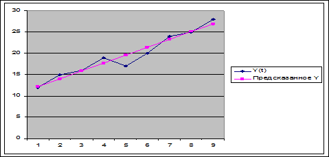 Средствами MSExcel получена следующая линейная модель: Yp ( t) = 1,85 t+ 10,30 Построим график эмпирического и смоделированного рядов: