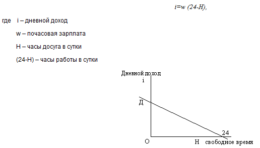 На графике изображена бюджетная линия “доход-досуг”. В т. Н на горизонтальной оси индивид может все свое время посвятить досугу, тогда Н=24 часам, дневной доход (i)=w (24-24)=0. В т. Д на вертикальной оси – другая крайняя возможность – посвятить все время работе по найму, тогда Н=0, дневной доход (i)=w (24–0)=24w. Чтобы определить, какую точку на прямой ДН выберет рабочий, нужна информация о его предпочтениях. Привычным способом характеризовать предпочтение лица, принимающего решения, является ряд кривых безразличия. Кривые безразличия «доход-досуг» указывают на предпочтения человека в отношении дохода и досуга.