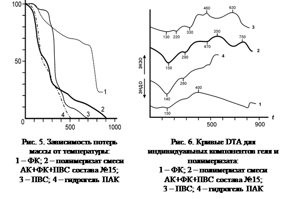 Все эти процессы протекают совместно и сложным образом влияют друг на друга. Разрушение гидрогеля начинается с удаления связанной воды. Потери массы на этой стадии составляют 53%, табл. 4, доля воды в гидрогеле 57% (рис. 5). В интервале температур 260 – 3300 С протекают эндотермические реакции дегидратации ПВС и декарбоксилирования ПАК (рис. 6). Суммарная энергия активации этих процессов составляет Еа = 9,5 кДж/моль. Эта энергия ниже, чем при деструкции индивидуальных компонентов, что объясняется активирующим влиянием протонов, образующихся при диссоциации ФК на процессы отщепления карбоксилов. В интервале температур 290-4700 С происходит деструкция основных полимерных цепей, кипение ФК и процессы структурирования. Суммарная энергия активации таких процессов составляет – 318,9 кДж/моль. При температурах 470-6700 С завершаются процессы структурирования и формирования кокса, который разрушается при температуре более 6700 С.