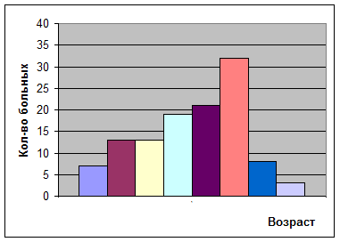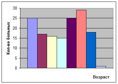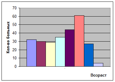 Диаграмма №3. Количество больных гриппом по возрастам в период эпидемии гриппа с 15 января по 15 февраля 1999 года. Кроме рентгенологического обследования всем поступившим больным обязательно производилось гематологическое исследование крови. Оценивались показатели гемоглобина, количество лейкоцитов. СОЭ, у наиболее тяжелых больных - количество эритроцитов и тромбоцитов. Производился подсчет лейкограммы. При написании данной статьи произведена большая работа по статистической обработке всех гематологических показателей крови при пневмонии и гриппе, учитывая пол больных. Были получены средние значения всех показателей, ошибка средней величины, рассчитаны среднеквадратические отклонения и коэффициенты вариаций.