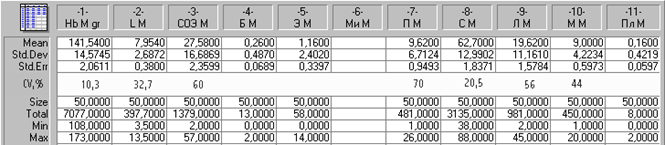 В таблицах 1 и 2 представлены данные гематологического исследования у больных (женщин и мужчин) с подтвержденным диагнозом острой пневмонии. Таблица №1. Статистические данные гематологических показателей крови у больных пневмонией (женщины) в период эпидемии гриппа с 15 января по 15 февраля 1999 года.