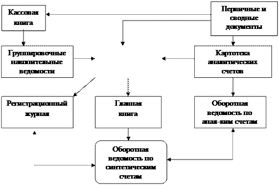 Положительные качества – в довольно простом построении. Вместо многочисленных регистров синтетического учёта используется один регистр – Главная книга[4]. Её особенности следующие[5]: · отдельный регистр синтетического учёта – Главная книга; · в Главной книге столько разворотов, сколько у фирмы счетов: левая страница каждого разворота – дебет какого-либо счёта, правая – кредит · записи в Главной книге делают ежедневно, причём дважды по каждой проводке: на дебетовой стороне одного разворота и на кредито · основное содержание каждого документа в журнале не регистрируют, а копируют в небольшом служебном документе, именуемом мемориальным ордером, где указывают проводку, то есть записи в Главной книге делают на основании мемориальных ордеров; · в журнале регистрируют мемориальные ордера; · для контроля записей в Главной книге используют оборотную Недостатки мемориально-ордерной формы[4]: · многократность записей одной и той же суммы в учётные регистры, увеличивается объём работ, а значит, и вероятность допущения ошибок; · отсталость аналитического учёта и открываемость синтетического; · приспособленность к использованию ручного труда и средств малой механизации. При составлении большого количества мемориальных ордеров допускается следующее[5]: · составлять один ордер на группу однородных документов; · или мемориальный ордер не составлять, а проводку указывать в самом документе; · или указывать общую проводку на последнем из пачки однородных документов. Эти варианты придают живучесть форме, которую традиционно именуют мемориальной формой бухгалтерского учёта, даже при отсутствии мемориальных ордеров. [5] 2.5. Журнально-ордерная форма бухгалтерского учёта Журналы-ордера – учётные регистры хронологической регистрации хозяйственных операций синтетического и в ряде случаев аналитического учёта. Регистрация происходит по кредитовому признаку, т.е. по кредиту данного счёта в корреспонденции с дебетуемыми счетами. [4] Журнально-ордерная форма характерна следующим: а) ядром её являются журналы-ордера (8 или 16). Каждый журнал-ордер содержит кредитовую сторону одного или нескольких бухгалтерских счетов и, соответственно, посвящён определённой группе проводок; б) записи в журналы-ордера делают непосредственно по данным первичных документов, т.е. в журналах-ордерах и регистрируют документы, и указывают проводки; в) итоги каждого журнала-ордера по окончании месяца переносят в Главную книгу, где есть НС, формируют дебетовые обороты и новое сальдо по каждому счёту. [5] В Главной книге каждому счёту посвящён разворот, а каждая строка содержит параметры счёта за определённый месяц. [5] Журналы-ордера состоят из двух частей: правая сторона – регистр непосредственно журнал-ордер, левая – дебетовая ведомость для расшифровки дебетовых оборотов. [3] В журналы-ордера записывают: сальдо начальное, суммы по дебетуемым и кредитуемым корреспондентским счетам (в порядке исключения кассовые операции, операции по расчётному счёту и валютному счёту в банках регистрируют в журналы-ордеры по кредиту, а в ведомости – по дебету). Итоговые данные в конце месяца переносят в Главную книгу. По данным Главной книги составляется Бухгалтерский баланс. Схема 2.2