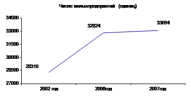 Рис. 1. Удельный вес малых предприятий в основных экономических показателях За последние годы в Республике Беларусь наблюдается положительная динамика количественного роста субъектов малого предпринимательства. Количество малых предприятий в Беларуси по данным Министерства статистики и анализа РБ по состоянию на 01.01.2008. составляло 33 094 единиц против 32 824 на 01.01.2007 г. рост за рассматриваемый год составил 0,8%. (рис. 2)