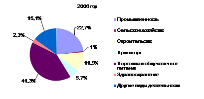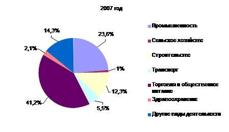 Рис. 3. Структура числа малых предприятий по отраслям экономики, % (на конец года) Общий объем продукции и услуг, произведенных малыми предприятиями, составил в 2007 г. 10331,5 млрд. руб., что (без поправки на инфляцию) превысило показатель 2006г. на 21,3%. В целом за 2007г. (по сравнению с 2000 г.) объем производства малых предприятий вырос в 6,6 раз. Уровень развития малого предпринимательства в регионах во многом зависит от таких факторов, как выгодное географическое положение, уровень доходов населения, наличие развитой инфраструктуры, отношение со стороны местных властей. Более половины (54,1%) частных малых предприятий и почти четверть индивидуальных предпринимателей без образования юридического лица (22,5%) сконцентрированы в г. Минске. В областях малый бизнес примерно на 50% сосредоточен в областных центрах. Государственная политика в области развития и поддержки предпринимательства становится неотъемлемой частью экономической политики страны. Система государственной поддержки малого предпринимательства начала формироваться после принятия в 1996 г. Закона Республики Беларусь ”О государственной поддержке малого предпринимательства в Республике Беларусь“. С 1997 г. разрабатываются и реализуются годовые программы государственной поддержки малого предпринимательства. Утверждена Программа государственной поддержки малого предпринимательства в Республике Беларусь на 2007 г., целью которой является дальнейшее формирование благоприятных условий для устойчивого развития малого бизнеса на основе совершенствования форм и методов государственной поддержки данного сектора экономики. К настоящему времени сложилась и функционирует единая система поддержки предпринимательства, имеющая следующую структуру: Департамент по предпринимательству Министерства экономики, как государственный орган, отвечающий за проведение в жизнь государственной политики по поддержке предпринимательства, Белорусский Фонд финансовой поддержки предпринимательства, областные учреждения финансовой поддержки предпринимателей, субъекты инфраструктуры поддержки предпринимательства в регионах (центры поддержки предпринимательства, инкубаторы малого предпринимательства), некоммерческие организации предпринимателей. Для решения проблем, сдерживающих развитие предпринимательства, функционирует Совет по развитию предпринимательства в Республике Беларусь, при Совете Министров – Межведомственная комиссия по поддержке и развитию малого предпринимательства, при Министерстве экономики – рабочая группа, в состав которой включены представители некоммерческих организаций предпринимателей, на областном уровне – советы (комиссии) по развитию предпринимательства. В целях повышения уровня организации взаимодействия индивидуальных предпринимателей, собственников (арендодателей) торговых мест, местных исполнительных и распорядительных органов на рынках и иных торговых объектах республики созданы советы индивидуальных предпринимателей. В целях обеспечения гарантий, соблюдения прав и законных интересов лиц, осуществляющих предпринимательскую деятельность, расширения рынка товаров и услуг, формирования в стране благоприятного экономического климата Президентом Республики Беларусь подписаны Указы от 24 марта 2007 г. № 148 «О неотложных мерах по поддержке
