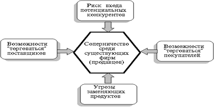 На рис. 1 цифрами обозначены следующие группы товаров: 1. Электронные книги 2. Моноблоки 3. Неттопы 4. Нетбуки 5. Ноутбуки. Таким образом можно сделать вывод о том, что ноутбуки, которые занимают основное место в объеме продаж фирмы постепенно перестают быть «звездами» и переходят в разряд «дойных коров», становясь предметом повседневного пользования, становясь более доступными для покупателей. А вот в разряде «звезд» на данный момент прочно укрепились нетбуки. Они популярны благодаря своей мобильности, интересному дизайну. Это то, что нужно активным, современным людям, тем, кто часто ездит в командировки. Электронные книги, моноблоки и неттопы совсем недавно всколыхнули общественность. Темп роста предложения этих товаров на рынке города Брянска очень велик. Все продавцы компьютерной техники стараются быстрее конкурентов предложить новинки, даже не смотря на то, что объем продаж их сравнительно не велик, большинство людей даже и не знают о таких «приспособлениях». Таким образом, в плане конкуренции товара покупатель в зависимости от своих требований может решить стоит ли ему приобретать ноутбук или же стоит отдать предпочтение компьютеру, а соответственно стоит ли идти в магазин, где представлены лишь ноутбуки или в компьютерный магазин. Конечно, ноутбук продает себя сам своей мобильностью, однако еще один важный фактор в пользу конкурентов — консервативные взгляды населения, мнение о том, что ноутбук — ненадежная техника, и уступает в мощности компьютеру, к тому же и стоит дорого. Существует серьезная ценовая борьба между конкурирующими фирмами, особенно тяжело конкурировать с крупными торговыми сетями, в которых предлагаются различные акции для привлечения покупателей. Эльдорадо, например, часто предлагает некоторые модели ноутбуков по цене, значительно ниже, чем даже себестоимость того же ноутбука в «Артбуке». Или же Мвидео по договоренности с банком предлагает очень выгодные условия кредитования на свои товары, в том числе и ноутбуки. В борьбе за клиентов каждая компания прибегает к различным «уловкам». Старается применять различные традиционные и не очень маркетинговые ходы. Помимо традиционной в рыночных условиях ценовой конкуренции (согласно которой борьба за потребителя ведется в области снижения цен) применяются и неценовые методы ведения конкурентной борьбы. 2.2 Глубокий анализ внешней среды Различают внешнюю среду прямого и косвенного воздействия. К среде прямого воздействия относят фирмы-конкуренты, покупателей, поставщиков; косвенного – политические, экономические, социальные и технические факторы (PEST-факторы). Рассмотрим подробнее воздействие каждого из факторов на анализируемую фирму. Портер предложил для анализа факторов прямого воздействия модель пяти сил (Рис. 2).