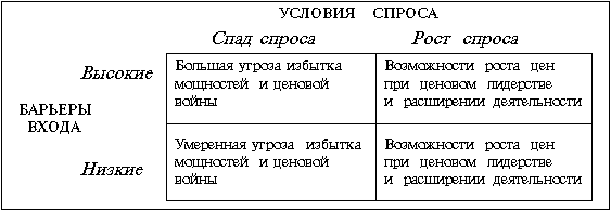 Рис. 2. Пять сил Портера. Риск входа потенциальных конкурентов (первая сила Портера) создает опасность прибыльности компании. С другой стороны, если этот риск мал, компания может повышать цену и увеличивать доходы. Конкурентная сила этого фактора сильно зависит от высоты барьеров входа (стоимости входа в отрасль). Имеется три основных источника таких барьеров: - лояльность к торговой марке покупателей (входящие компании должны перекрыть это значительными инвестициями); - абсолютное преимущества по издержкам (более низкие издержки производства обеспечивают существующим компаниям существенные преимущества, которые трудно достичь новым компаниям); - экономия на масштабе (это преимущество ассоциируется с большими компаниями). Она связана со снижением издержек при массовом производстве стандартизированной продукции, скидками при больших закупках сырья, материалов и комплектующих, снижением удельных расходов на рекламу и т.д. Все это создает значительные трудности для компаний, начинающих производство. Среди недавно появившихся конкурентов в отрасли розничной торговли компьютерной техникой можно выделать магазин «Точка доступа», открывшийся в Советском районе. Второй конкурентной силой по Портеру является соперничество существующих в отрасли компаний. Здесь следует выявить влияние трех факторов: - структуру отраслевой конкуренции, - условия спроса, - высоту барьеров выхода в отрасли. Структура отраслевой конкуренции зависит от степени консолидации в отрасли (фрагментарная ли она,имеются условия олигополии или монополии). Фрагментарная отрасль представляет потенциально больше угроз, чем благоприятных возможностей, т.к вход в такие отрасли сравнительно легок. В консолидированных отраслях компании, как правило, большие и независимые. Таким образом, конкурентные действия одной компании прямо воздействуют на рыночную долю конкурентов, вызывая их ответные действия и раскручивая спираль конкуренции. Возможности таких компаний вести ценовую войну представляют главную конкурентную угрозу. В этом случае компании стремятся конкурировать по качественным отличительным преимуществам, т.е. конкурентная война ведется с позиций лояльности к торговой марке и минимизации вероятности ценовой войны. Успех такой тактики зависит от возможностей в отрасли дифференциации продукции. Рост спроса в отрасли ведет к умеренной конкуренции при обеспечении больших возможностей для экспансии. Спрос растет вместе с рынком, компании могут увеличить скорость возврата инвестиций, и это делает компанию более привлекательной. Наоборот, снижение роста вызывает большую конкуренцию, компании могут отобрать рынки сбыта только у других компаний. Таким образом, уменьшение спроса - главная опасность увеличения конкуренции. Барьеры выхода являются серьезной опасностью,когда спрос в отрасли падает. Барьеры выхода являются экономическими и эмоциональными факторами, которые удерживают компанию, даже если доходы малы. В результате появляются излишние производственные мощности, что ведет к интенсификации ценовой конкуренции, т.к. компании сбрасывают цены, пытаясь использовать простаивающие мощности. Обычно барьеры выхода включают следующие обстоятельства: - инвестиции в оборудование не имеют альтернатив их использования и, если компания оста
