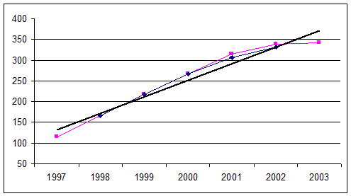 Из 24 предприятий 37,5% имеют среднегодовую стоимость основных производственных фондов от 2,2 до 3,4 млн. руб. в среднем на предприятии работают 310 человек, наибольшее количество работающих у предприятий имеющих среднегодовую стоимость основных производственных фондов от 4,6 до 5,8 млн. руб. – 431,7 чел., при росте среднегодовой стоимости основных производственных фондов, наблюдается рост численности работников, исключением является группа предприятий с самой большой среднегодовой стоимостью основных производственных фондов, где наблюдается снижение численности работников. Производство продукции существенно растет при росте стоимости основных производственных фондов. Так же наблюдается рост % выполнения плана при увеличении стоимости основных производственных фондов, исключением здесь является группа предприятий со стоимостью основных производственных фондов от 2,2 до 3,4 млн. руб., в ней самый низкий % выполнения плана. Задача № 2 По данным варианта определить: 1. Показатели динамики с постоянной и переменной базой сравнения. 2. Графически изобразить ряд динамики в зависимости от номера варианта. 3. Рассчитать среднегодовые показатели динамики. 4. Произвести сглаживание ряда методом 3-х летней скользящей средней. 5. Выровнять ряд по прямой. 6. Построить графики исходного и выровненных рядов. 7. Использовать полученное уравнение для экстраполяции уровней на 2008 год. 8. Сделать выводы.