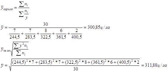 Для урожайності цукрових буряків: 300,85<304,51<308,20<311,88 для кількості міжрядних обробітків: 1,77<1,82<1,87<1,92 для якості грунту: 70,54<70,90<71,27<71,64 Знайдемо деякі показники для урожайності цукрових буряків: Розмах варіації: R =у max -у min R=225-420=195 Середнє лінійне відхилення: Дисперсія: