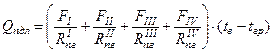 де: FI , FII , FIII , FIV – площі підлоги, відповідно першої, другої, третьої, четвертої зони, м2 ; tв , tгр - відповідно внутрішня температура приміщень над підлогами і температура ґрунту (для практичних розрахунків приймається температура ґрунту tгр =+40 С); 2.2.1 Сумарні втрати теплоти через огороджуючі конструкції визначаються по наступному вираженню