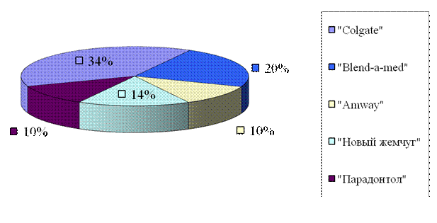 На вопрос «Какой маркой зубной пасты вы пользуетесь?» получены следующие результаты: «Colgate» (34%), «Blend-a-med» (20%), «Amway» (10%), «Новый жемчуг»(14%) и «Парадонтол» (10%) (рисунок 3). Следует отметить, что ряд респондентов не смогли вспомнить названия зубной пасты, которыми они пользуются, что является косвенным подтверждением для отнесения таких потребителей к «пассивным» (не делающим самостоятельных покупок).