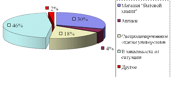 Местом приобретения зубной пасты являются: магазины «Бытовой химии» (30%), аптеки (4%), специализированные отделы универсамов (18%), в зависимости от ситуации (46%), другое (2%) (рисунок 5). Отрадно, что не производится покупок с открытых торговых площадок рынков.