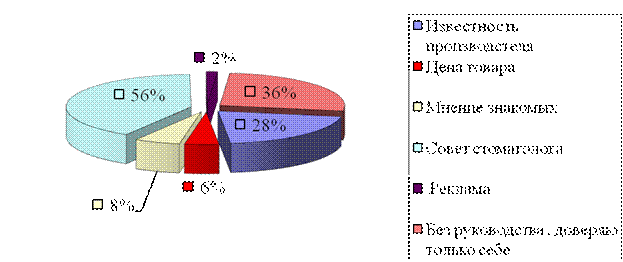 При выборе зубной пасты для опрошенных главным является совет стоматолога (56%), известность производителя (28%), мнение знакомых (8%), цена (6%), реклама (2%)(рисунок 6). В комментариях потребители отмечают, что вложение денег в собственное здоровье является положительной инвестицией. Однако 36% респондентов считают, что консультация со специалистом при подборе зубной пасты не является необходимостью.