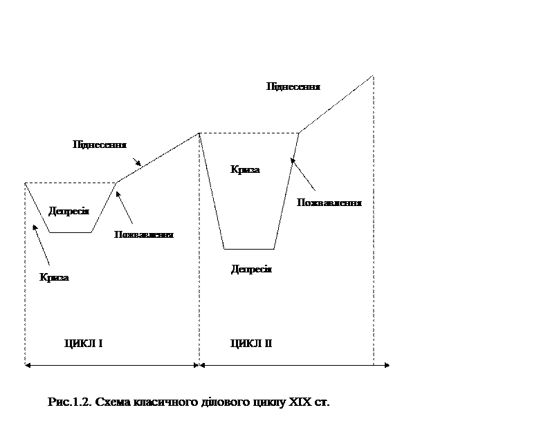 11 Із рис.1.2. зрозуміло, що цикл – це період між двома падіннями обсягів національного виробництва, або це період між двома кризами. Цикл має 4 фази: криза, депресія, пожвавлення та промислове піднесення. Схарактеризуємо кожну фазу. Ознаки економічної кризи: · перевиробництво товарів порівняно з платоспроможним попитом на них; · різке падіння цін, зумовлене перевищенням пропозиції над попитом; · падіння обсягів виробництва і, як наслідок, падіння норми прибутковості; · зростання запасів; · збільшення кількості банкрутств; · зростання рівня безробіття; · падіння рівня доходів; · потрясіння кредитної системи (різке зростання норми процента у зв’язку з тим, що попит на гроші зростає, а пропозиція зменшується внаслідок відпливу грошових капіталів із банків, різке скорочення комерційних і банківських кредитів, падіння курсу акцій і облігацій і т. ін..). Характерні ознаки депресії: · зменшення запасів; · призупинення різкого падіння цін; · призупинення падіння виробництва; · зменшення пози кого процента; Ознаки пожвавлення та піднесення: · зростання виробництва; 12 · зростання загального рівня цін; · зменшення рівня безробіття; · зменшення запасів; · зростання рівня доходів; · розширення кредиту ( кредитна експансія) тощо. Класична схема циклічного розвитку властива економіці ХІХ ст.. У ХХ ст. цикл модифікувався. Головними факторами, що зумовили модифікацію, вважають зміни, що відбулися в технологічному способі виробництва, та державне втручання в економіку. Схематично сучасний діловий цикл можна зобразити таким чином, як на рис.1.3.[1.348.]