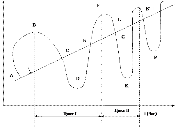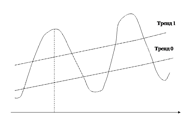 ![]() Рис.1.3. Схема сучасного ділового циклу 13 Точки B,F,M- пікові точки; Точки D,K, P- нижчі точки (дно) Відрізки BD, FK, MP на рис.1.3. відображають рецесію, а відрізки AB, DE, KM- розширення виробництва. Рецесія - це період зниження рівня сукупного випуску, доходу, зайнятості та торгівлі, який продовжується від 6 місяців до 1 року та характеризуються значним занепадом багатьох секторів економіки. Особливості сучасного економічного циклу: · зміна чотирифазної моделі циклу на двофазну; · повні цикли (відстань між піком і дном) суттєво відрізняються між собою за тривалістю; · починаючи з другою половини ХХ ст., відбувається скорочення фази економічного падіння, тоді як фаза розширення виробництва стала тривалішою; · повторюваність криз стала частішою, але менш глибокою. Бізнес-цикл (економічний цикл)- це тимчасове відхилення від довгострокової тенденції економічного зростання. Тобто діловий цикл - це коливання ділової активності навколо тренда. У сучасній економічній теорії існує альтернативний підхід до теорії циклів. Так, Олівер Бланхард і Стенлі Фішер стверджують, що коливання ділової активності можуть бути спричинені як тимчасовими відхиленнями від зростаючого тренда, так і впливом постійних шоків на сам тренд. Саме остання причина зумовлює суттєві випадкові зміщення тренда (рис.1.4.) 14