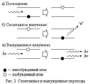 Рассмотрим схему энергетических уровней некоторого атома (рис.1). Зная, что, если атому, находящемуся на основном уровне W1 , сообщить энергию, то он может перейти на один из возбужденных уровней (рис.2а). Наоборот, возбужденный атом может самопроизвольно (спонтанно ) перейти на один из нижележащих уровней, излучив при этом определенную порцию энергии в виде кванта света (рис.2б). Если излучение света происходит при переходе атома с уровня энергии Wm на уровень энергии Wn , то частота излучаемого (или поглощаемого) света νmn = (Wm - Wn )/h. Именно такие спонтанные процессы излучения происходят в нагретых телах и светящихся газах. Нагревание или электрический разряд переводят часть атомов в возбужденное состояние; переходя в нижние состояния, они излучают свет. В процессе спонтанных переходов атомы излучают свет независимо один от другого. Кванты света хаотически испускаются атомами в виде волновых цугов. Цуги не согласованы друг с другом во времени, т.е. имеют различную фазу. Поэтому спонтанное излучение некогерентно.
