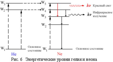 Условия, необходимые для создания источника когерентного света: · нужно рабочее вещество с инверсной населенностью. Только тогда можно получить усиление света за счет вынужденных переходов; · рабочее вещество следует поместить между зеркалами, которые осуществляют обратную связь; · усиление, даваемое рабочим веществом, а значит, число возбужденных атомов или молекул в рабочем веществе должно быть больше порогового значения, зависящего от коэффициента отражения выходного зеркала. При выполнении этих трех условий мы получим систему, способную генерировать когерентный свет, и называемую лазером . Слово "лазер" составлено из первых букв английской фразы:"L ight a mplification by s timulated e mission of r adiation", что означает "усиление света с помощью вынужденного излучения". Генерация когерентного света происходит одинаково во всех лазерах, как газовых, так и твердотельных. Особенности газового лазера и отличие отдельных видов газовых лазеров друг от друга связаны с выбором рабочего газа и способом создания инверсии населенностей. 2.2 ПРИНЦИП РАБОТЫ ГЕЛИЙ-НЕОНОВОГО ЛАЗЕРА Рассмотрим более подробно (рис. 6) способ осуществления инверсии населенностей на примере гелий-неонового лазера . 1.В гелий-неоновом лазере рабочим веществом являются нейтральные атомы Ne . В электрическом разряде часть атомов Ne переходит с основного уровня W1 на долгоживущие возбужденные уровни W5 и W4 .