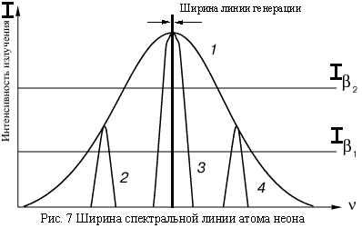 определяет область частот, в которой может иметь место генерация света при инверсии населенностей соответствующего перехода. Оптический резонатор, состоящий из двух плоских параллельных зеркал (резонатор Фабри-Перо), вырезает из этой относительно широкой спектральной линии гораздо более узкие линии (2, 3, 4), соответствующие собственным частотам резонатора. Если усиление в Ne