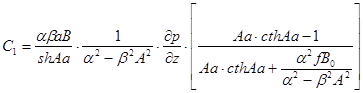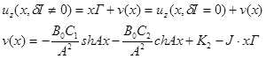 Произведем замены: и (5) примет вид: Решение однородной части является комбинация гиперболических синуса и косинуса. Учет неоднородности дает: где С1 и С2 – константы интегрирования. Подставим (8) в первое уравнение системы (3) и вводя обозначение