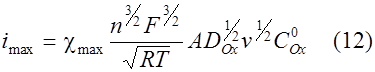 Найденная любым из приведенных способов функция определяет форму вольтамперных кривых в случае обратимого электродного процесса. Уравнение тока пика легко получили на основе уравнения (7) и графика функции (8 - 11). Это выражение известно как уравнение Рендлса - Шевчика: