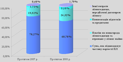 Рисунок 3.13. Вартісний розподіл придбаних предметів лізингу за групами основних засобів за 2008 р. в порівнянні з попереднім періодом В структурі лізингових платежів основну частку займають погашення вартості предмету лізингу - 68,78%, а також комісія лізингодавця - 24,32%. В зв’язку із зростанням ризикованості інвестиційного кредитування в поточному році, питома вага комісійної винагороди та компенсації відшкодування відсотків за кредитами зросла. Крім того, ще одним фактором зростання питомої ваги комісійних платежів є девальвація гривні, курсові різниці від якої закладаються в комісійні платежі клієнта. Рисунок 3.14. Структура лізингових платежів за 2008 р. в порівнянні з минулим роком
