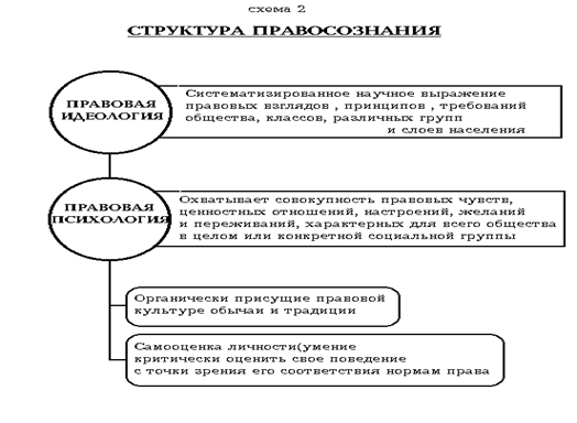 Правосознание в своей структуре содержит правовую идеологию и правовую психологию. Правовая идеология (см. схему 2) должна формироваться как процесс выявления теоретического осознания, координации и согласования различных общественных интересов через достижение социального компромисса. В этом случае правовая идеология будет содержать большой нравственный потенциал, подразумевающий приоритет прав и свобод личности, разделение властей, политический плюрализм, высокую роль суда, как политического антипода командно-бюрократическому управлению, что свойственно идеологически и экономически здоровому обществу с развитой общей и правовой культурой. Правовая идеология обосновывает и оценивает существующие или возникающие правовые отношения, законность и правопорядок.