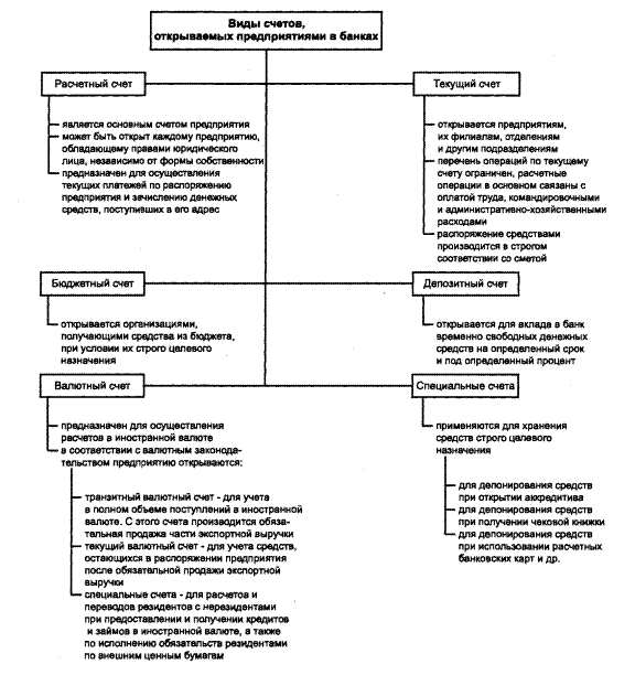 Рис. 2. Виды счетов, открываемых предприятиями в банках Банк обязан заключить договор банковского счета с клиентом, обратившимся с предложением открыть счет на объявленных банком для открытия счетов данного вида условиях, соответствующих требованиям, предусмотренным законом и установленными в соответствии с ним банковскими правилами (ст. 846 ГК РФ). Банк не вправе отказать в открытии счета, совершение соответствующих операций по которому предусмотрено законом, учредительными документами банка и выданным ему разрешением (лицензией), за исключением случаев, когда такой отказ вызван отсутствием у банка возможности принять на банковское обслуживание либо допускается законом или иными правовыми актами. При необоснованном уклонении банка от заключения договора банковского счета клиент вправе предъявить ему претензии, предусмотренные п. 4 ст. 445 ГК РФ. В соответствии с п. 9 ст. 5 Закона №395-1, открытие кредитной организацией банковского счета юридическому лицу осуществляется на основании: · свидетельства о государственной регистрации юридического лица; · свидетельства о постановке на учет в налоговом органе. Вместе с перечисленными документами в банк предоставляется карточка с образцами подписей и оттиска печатей, оформленная в соответствии с указанием ЦБ РФ от 21 июня 2003 г. № 1297-У. Карточка с образцами прописей и оттиска печати подписывается руководителем и главным бухгалтером предприятия, которому открывается счет. право первой подписи принадлежит руководителю предприятия, а также должностным лицам, уполномоченным руководителем. Право второй подписи принадлежит главному бухгалтеру или лицам, уполномоченным на ведение бухгалтерского учета письменным распоряжением. Правом первой и второй подписи могут обладать одновременно несколько работников предприятия. При этом сотрудник предприятия не может быть наделен одновременно правом первой и второй подписи. Если в штате предприятия нет должности главного бухгалтера (другого должностного лица, выполняющего его функции), карточка подписывается только руководителем. В этом случае в карточке в поле «Фамилия, имя, отчество» вместо указания лица, наделенного правом второй подписи, указывается: «Бухгалтерский работник в штате не предусмотрен» Подлинность собственноручных подписей лиц, обладающим правом первой и второй подписи, может быть удостоверена нотариально. Карточка может быть оформлена без нотариального свидетельствования подлинности подписей в присутствии сотрудника кредитной организации в соответствии с порядком, установленным указанием ЦБ РФ от 21 июня 2003 г. № 1297-У. Банк обязан сообщить об открытии или закрытии счете организации, индивидуального предпринимателя в налоговый орган по месту их учета в пятидневный срок со дня соответствующего открытия или закрытия такого счета (ст. 86 ч I НК РФ). Отсутствие договора банковского счета в виде единого документа, подписанного сторонами, не означает отсутствия договорных отношений. При открытии банковского счета возникают 2 группы отношений: Во-первых, банк обязуется принимать и зачислять на счет денежные средства, которые перечисляются его клиенту, а также выдавать по требованию последнего необходимые уму сумму в порядке, установленным законодательством и договором. Банк может использовать находящиеся на счете д