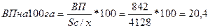 где ВП – валовая продукция по сопоставимым ценам, тыс. руб.; Sс/х – площадь земельных сельхоз угодий, га. Товарная продукция на 100 га определяется по формуле:
