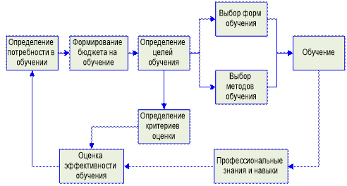 Рисунок 1 – Модель систематического обучения [7, с.49] Следуя модели систематического обучения, схема обучения будет выражена так: личность не может на должном уровне выполнить задачу и поэтому нуждается в обучении. Определение потребностей в обучении может предприниматься на различных уровнях. Потребности организации в целом должны быть проанализированы специалистом по кадрам или отделом обучения в соответствии с общими производственными целями и политикой организации в планировании рабочей силы. При этом определяется необходимость обучения конкретных групп работников по всем подразделениям после консультаций с линейными менеджерами. Эта работа должна также включать в себя анализ ожидаемого эффекта от воздействия обучения на выполнение организацией производственных задач. Обучение персонала обеспечивает соответствие профессиональных знаний и умений работника современному уровню производства и управления. Обучение рабочих и служащих включает четыре основных вида. 1. Профессиональная подготовка. Существует начальная, средняя и высшая профессиональная подготовка рабочих и специалистов с получением документа об образовании (диплом, свидетельство). Срок обучения от 1 до 6 лет. 2. Повышение квалификации. Выполняется на профессиональных курсах, в школах менеджеров, на факультетах повышения квалификации и в институтах бизнеса. Срок обучения от 1 дня до 6 месяцев. 3. Переподготовка кадров. Выполняется в учебных заведениях, когда рабочие овладевают второй профессией, а служащие второй специальностью. Срок обучения от 6 до 24 месяцев. 4. Послевузовское профессиональное образование. Осуществляется для получения высшей профессиональной или научной квалификации в аспирантуре или докторантуре. Срок обучения - 2-4 года. Другая схема организации учебного процесса приведена на рисунке 2.