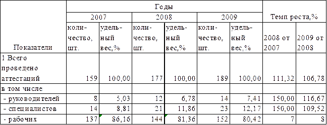 Данные таблицы 2.3 свидетельствуют о том, что в 2009 году количество аттестаций выросло на 12 штук, в основном аттестации подлежали рабочие, 80,42 %, количество руководителей прошедших аттестацию выросло на 2 человека, и специалистов на 2 человек. В 2008 году по сравнению с 2007 годом количество аттестаций выросло на 18 штук, рост наблюдался по рабочим и специалистам на 7 штук, а по руководителям на 4 штуки. В течение 2007-2009 года работников не прошедших аттестацию не было, поэтому можно говорить о том, что как рабочие, так и служащие Березинского райпо имеют хорошую подготовку и серьезно относятся к своей работе. После проведения аттестации работники отдела кадров обрабатывают всю информацию на компьютерах, однако в Березинском райпо нет компьютерных программ для того чтобы упростить и облегчить этот и другие процессы происходящие в предприятия, что является отрицательным моментом. Одной из функций отдела кадров Березинского райпо является проведение обучение работников организации, обучение персонала проводится в соответствии с утвержденным председателем правления планом подготовки кадров на плановый год. План обучение персонала на предстоящий год составляется специалистом по кадрам. Персональную ответственность за организацию и учебно-методическую работу в райпо осуществляет отдел кадров организации. В своей деятельности заместитель председателя правления по кадрам и идеологической работе, которому подчиняется отдел кадров, руководствуется действующим законодательством, приказами и указаниями вышестоящих организаций. В условиях рыночной экономики потребности организаций в квалифицированных рабочих кадрах в значительной степени удовлетворяются за счёт их подготовки и переподготовки непосредственно в организации. В Березинском райпо отдел кадров учёт числа обученных кадров, работников, которые повысили квалификацию, прошли переподготовку или стажировку, а также ведёт учёт затрат на эти цели. Для того, что бы рассмотреть динамику изменения количества работников проходящих обучение в 2007 -2009 годах составим таблицу 2.4. Таблица 2.4 - Динамика профессионального обучения работников Березинского райпо в 2007-2009 гг.