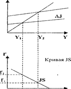 ΔY Y Небольшие изменения процента в экономике приводят к значительным изменениям объема национального производства. Если JS пологая, то это означает высокую чувствительность инвестиций к динамике процентных ставок. Пологая JS будет также при высокой склонности к потреблению и относительно низких ставках налогообложения. Если же LM будет пологой, JS крутой, то монетарная политика неэффективна - значительные изменения процентных ставок слабо изменяют объем производства: LM1