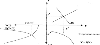 Если в модель JS/LM ввести рынок труда и производственную (функцию. то получим модель Хикса - Хансена - Модильяни: 1. Функция дохода: Y= C(Y,r) +J ( Y , r ). 2. Производственная функция:Y —f ( N ). 3. Спрос на реальные денежные остатки: (М/Р)D =L(Y,r). 4. Спрос на труд : f '(N) =F ( W / P ). 5. Предложение труда N = N(W/P) Здесь N - занятость, количество работающих по найму, W/P - реальная заработная плата. Графически эту модель можно изобразить так: