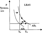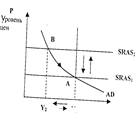 Y = Yo + αΔP – уравнение для долгосрочного периода. Существует несколько теорий, объясняющих такой вид AS, то, что объем производства пропорционален объёму цен. Это теория несовершенной информации, теория неверных представлений о динамике цен, на основе которых принимаются решения по увеличению или уменьшению объёма выпуска. Резкие изменения совокупного спроса и предложения —шоки — приводят к отклонению объема выпуска и занятости. Шоки со стороны спроса возникают при изменении денежной массы или инвестиций. Шоки предложения вызываются резкими скачками цен, природными катаклизмами, изменениями в законодательстве. Допустим, происходит шоковый рост цен. Это поднимает краткосрочную кейнсианскую линию предложения с AS1 до AS2 . Объем производства при этом упадает с уровняY * до Yв . В долгосрочном периоде цены постепенно упадут, а величины выпуска и занятости восстановятся. Чтобы нейтрализовать спад, необходимо резко увеличить спрос (например, посредством увеличения денежной массы), но при этом цены останутся на высоком уровне Рс: P