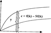 k (капиталовооруженность)Затем вводится функция потребления - спрос со стороны инвесторов и потребителей: у = с + i - в расчете на одного работника . i - инвестициина одного работника; с - потребление на одного работника. По Солоу с = (1- S ) y , где S - норма сбережения. Подставляя это значение в предыдущую формулу, получим: у = (1- S ) y + i или i = S у . Если заменим у производственной функцией f ( k ) , то получим i = Sf ( k ), т.е. чем выше капиталовооруженность труда k, тем больше объем производства и больше инвестиции. Это уравнение связывают существующие запасы капитала k и накопление нового капитала i . Связь между производством, потреблением и накоплением можно показать на графике: