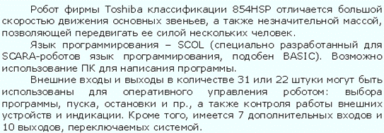 5)Смешенная система координат Роботы этого класса обладают, как правило, малой грузоподъемностью и высокой точностью позиционирования. Используются для автоматизации сборочных операций, распределения наполнителей, в «чистых» производствах. Toshiba SR-854HSP Широкое применение на операциях сборки, перемещения, упаковки, обслуживания конвейеров в различных отраслях промышленности.