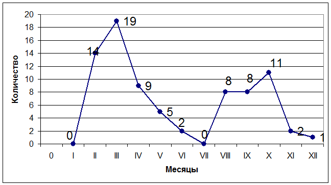 2. Порода. Анализ данных таблицы 1 показывает, что наиболее часто уролитиазом страдают беспородные кошки (79%). Среди породистых чаще болеют персидские (62%) и сиамские (27%). Встречаемость мочекаменной болезни среди других пород незначительна (единичные случаи). Диаграмма 3 Распределение мочекаменной болезни по породе 3. Пол Данные, приведенные в диаграмме 2 наглядно демонстрируют, то, что среди животных уролитиазом, коты подвержены заболеванию чаще, чем кошки. На долю кошек приходится 20,7 %, на долю котов - 79,3 %. Диаграмма 4 . Диаграмма 5 Диаграмма 6 3. Времена года. Зависимость обострения мочекаменной болезни от времени года представлена на графике 1,2,3,4, из которых видно, что вспышки заболевания кошек уролитиазом наблюдаются в осенне-весенний период. Продолжительность вспышки весной составляет три месяца (февраль, март, апрель, осенью - три - четыре месяца (сентябрь, октябрь, ноябрь, иногда август.) График 3. Сезонность заболеваемости уролитиаза кошек за 1995 год