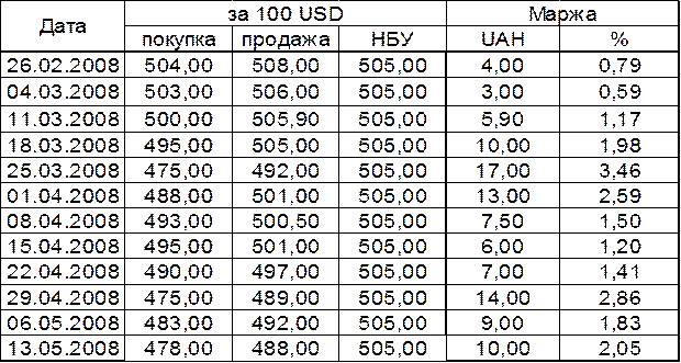 Рис.2.2. Динамика обменных валютных курсов и валютного курса НБУ гривни к российскому рублю (UAH / RUR). Далее рассчитала кросс-курсы валют на покупку на начальную и конечную дату с 26.02.2008 по 13.05.2008 г.г. Результаты занесла в таблицы 2.4 и 2.5. Кросс-курсы - это соотношение между двумя валютами, назначенное через их курс относительно третьей валюты. Расчет для украинской гривни осуществлялся по схеме: - украинская гривня / евро – Х грн. за евро; - украинская гривня / доллар США – Y грн. за доллар; Тогда кросс-курс евро к доллару будет составлять X / Y за один доллар США. Таблица 2.4 Кросс-курсы валют на покупку Таблица 2.5 Кросс-курсы валют на покупку 2.3. Анализ эффективности сохранения стоимости денежных средств на основании конверсионных операций и депозитных взносов. Если представить ситуацию, чтобы вложить определенную сумму, чтобы сберечь стоимость через конверсионные операции с валютами – в начале периода купить иностранную валюту, а в конце периода – продать соответственно к наличному валютному курсу гривни. Сумму гривень, которая будет потрачена на покупку иностранной валюты в начале периода, нужно будет сравнить с суммой гривень, которая будет получена в конце периода. И можно увидеть, где прибыль, а где убытки. Например, возьмем иностранную валюту евро: За 100 EUR