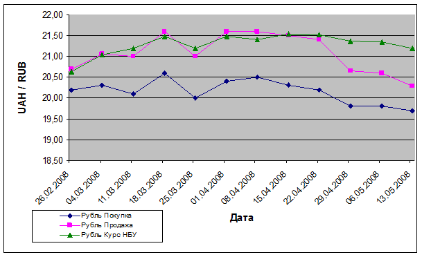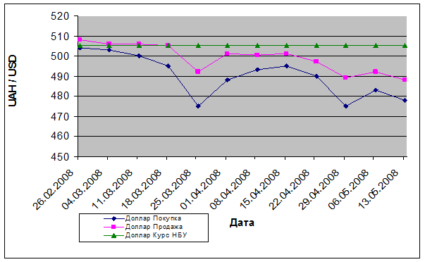 Рис.2.2. Динамика обменных валютных курсов и валютного курса НБУ гривни к доллару США (UAH / USD). Таблица 2.3 Наличный курс гривни к российскому рублю (UAH / RUR) за данными АКБ «Меркурия»