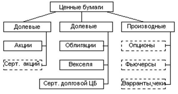 График 1.3. Основные события 1997 года и их влияние на российскийфондовыйрынок *1. Ввод новых лиц в правительство. *2. Вступление России в Парижский клуб. *3. Аукцион АО «Связьинвест». *4. Кризис мировых фондовых рынков. *5. Закончена реструктуризация российских долгов странам Парижского клуба. Чем же закончится новый майский кризис 1998 г. ещё не известно. Ставка рефинансирования Банка России взлетела до 150 %, ведь исходя из неё рассчитывается доходность ГКО - основной ценной бумаги российского рынка. Центробанк уже потратил более 1 млрд. долл. США на поддержку финансовой системы. Президент ищет понимания и собирает в Кремле крупнейших банкиров России. В США объявляют, что взаимопонимание достигнуто, но основная цель коммерческих банков – получение прибыли и сколько же будут стоить государству помощь банков? Неизвестно. Ведь банки тоже нуждаются в помощи государства. В этой ситуации больше всего в очередной раз выиграют фонды – «жар-птицы», а проиграем – все мы – и государство, и банки, и простые граждане. Но именно через такие моменты проходили ушедшие на 250 лет вперёд фондовые рынки Америки и Европы. Развитие рынка ценных бумаг России ещё впереди. 1.2. Виды ценных бумаг, обращаемых на Р.Ц.Б. Объектом купли-продажи на фондовом рынке являются разнообразные ценные бумаги. В зависимости от формы предоставления капитала и способа выплаты дохода ценные бумаги можно подразделить на долговые и долевые. Долговые ценные бумаги обычно имеют фиксированную процентную ставку и являются обязательством выплатить капитальную сумму долга на определённую дату в будущем. Недолговые бумаги, называемые долевыми ценными бумагами, или акциями, предоставляют непосредственную долю держателю в реальной собственности и обеспечивают получение дивиденда неограниченное время. Прочие виды ценных бумаг, производных от акций и долговых обязательств, которые закрепляют право их владельца на покупку и продажу акций и долговых обязательств. Основная теоретическая классификация приведена на рисунке 1. Рис. 1.1. Основная классификация рынка ценных бумаг