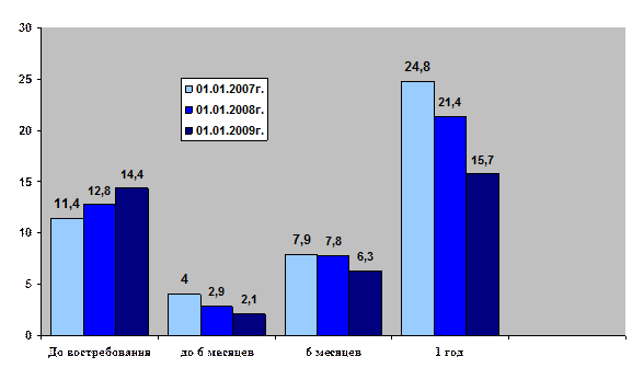 *Сост. по данным Бюллетеней банковской статистики ПФ АКБ «Стратегия», 2006-2008 гг. На основании данных таблицы можно сделать вывод о том, что наибольшее увеличение (на 10,8%) доли в структуре средств физических лиц ПФ АКБ «Стратегия» в рублях и иностранной валюте с 1 января 2006 по 1 января 2009 года произошло по срочным вкладам для экономически активного населения. В то же время доля срочных вкладов для пенсионеров достаточно велика, но из таблицы видно, что она снизилась на 3,5%. Доля вкладов «До востребования» и «Вклад НАМ – 9» упала на 3,7%. Структура депозитов физических лиц филиала в зависимости от сроков привлечения отражает инвестиционные ожидания и предпочтения вкладчиков. Так, доля средств, размещаемых населением в долгосрочные вклады, по итогам 2008 года, как и в прошлые анализируемые периоды, продолжила свой рост.