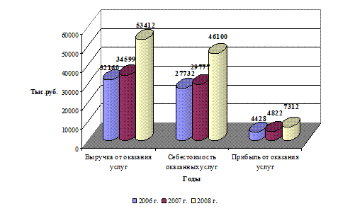 Как видно из таблицы 2.1.1, за 2008 год, в сравнении с 2006 и 2007 гг., экономические показатели заметно улучшились. Отмечается значительный рост объема от оказания услуг, так в 2007 году по сравнению с 2006 годом выручка от оказания услуг выросла на 2439 тыс. руб. или на 107,58%, а в 2008 году по сравнению с 2007 годом рост составил 18813 тыс. руб. или 154,37%. Динамика основных показателей деятельности анализируемого предприятия ООО «ТВ - Камск» представлена на рисунке 2.1.1.