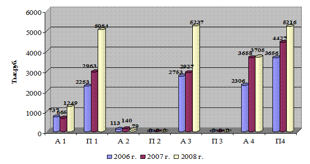 Как свидетельствуют данные таблицы 2.2.2, за анализируемый период возрос платежный недостаток быстрореализуемых активов для покрытия наиболее срочных обязательств (соотношение по первой группе). В 2006 году платежный недостаток присутствовал в сумме –1516 тыс.руб., в 2008 году сумма увеличилась до –3805 тыс.руб. Динамика актива и пассива баланса по степени ликвидности ООО «ТВ – Камск» за 2006 – 2008 гг. представлена на рисунке 2.2.1.