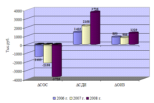 ООО «ТВ - Камск» имеет нормальную устойчивость финансового состояния, которая задается условием: МDСОС<0 , DСДИ ≥ 0 , DОИ≥0 , М (0;1;1) Для большей наглядности представим динамику абсолютных показателей финансовой устойчивости ООО «ТВ - Камск» на рис. 2.2.3.