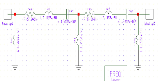 Рис. 6. Эквивалентная схема, использующая модель ПР из сосредоточенных элементов. Для получения АЧХ сопротивление и емкость рассчитаны по (2) и (5). Индуктивности взяты из таблиц 1 и 2. Этот метод аналогичен методу индуктивной связи между одинаковыми ПР, которая учитывается в эквивалентной схеме с помощью индуктивности, значение которой пропорционально значению индуктивности резонатора [13, с. 162]. На рис. 6, показана эквивалентная схема фильтра, используемая для одиночного ПР. Индуктивность контура