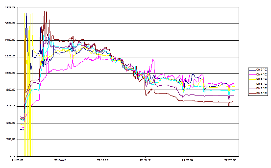 ![]() Рис 5. Показания измерений термопар в реальном времени при первом режиме