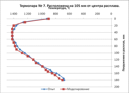 Рис 9. Сеточное разбиение модели Итогом расчетов стало получение распределения температурных полей в расплаве. Полученные температурные поля представлены на рис 10. ![]() Рис 10. Распределение тепловых полей в расплаве Расчет модели был проведен успешно. Были получены все данные необходимы по условию задачи. Имеющиеся данные достаточны для проведения их верификации с результатами полученными в результате физического эксперимента. 2.4 Верификация моделиВерификация математической модели проводилась путем сравнения температурного распределения в ванне расплава стекла, полученного путем математического моделирования, с данными измерений термопарами На Рис. 11 - 15 представлены графики температур, полученные в результате измерений термопарами и математического моделирования. На вертикальной оси указано расстояние от поверхности вглубь расплава, то есть заглубление в расплав. На горизонтальной оси указана температура в градусах Цельсия.