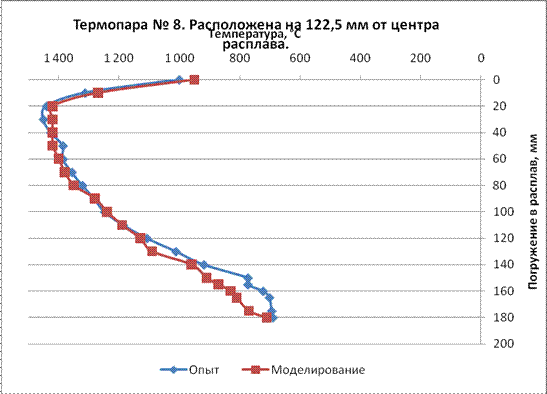 Рис 20. Расхождение модели и опыта для термопары № 8 Из рис. 11 - 15 и рис. 16 – 20 следует, что математическая модель адекватно отражает температурное поле. Имеется хорошее совпадение с экспериментом. Наибольшее отличие наблюдается у оси ванны расплава и в придонной области ванны у боковой стенки, то есть при низких температурах стекла. В области оси ванны экспериментальная температура выше. Это может объясняться тем, что во время теста в расплаве имеются 3D флуктуации расплава, которые приводят к выравниванию температуры в центральной области. В области дна экспериментальная температура ниже. Это может объясняться рядом причин. Например, погрешностью измерений термопарами в этой области или неточностью задания свойств стекла. Моделирование как видно из работы дает достаточно точные результаты. Несмотря на все отклонения от реальных экспериментов моделирование порой незаменимо для прогнозирования результатов сложно реализуемых задач. Моделирование на данный момент широко применяется для разработки и сборки установок для промышленного использования, а не для научной деятельности. Коммерчески выгоднее собирать самую эффективную и малозатратную установку. Так как в современном обществе финансовая сторона является почти всегда определяющей, развитие моделирования направлено на разработку более точных моделей, попыток смоделировать модели в 3-D постановке, более точно и полно задавать свойства материала и учитывать различные внешние факторы воздействия. К сожалению данные тенденции, хоть и ведут к разработке новых численных методов и улучшению качества моделей, а также наращиванию вычислительных мощностей, пагубно сказываются на научно-исследовательской деятельности. Потому что полная замена экспериментальных опытов не позволяет увидеть новые закономерности. Но только экспериментальные исследования также невозможны в наше время, так проведение одного опыта связано с большими затратами энергии и ресурсов. Очевидно, оптимальной стратегией научных исследований является сочетание экспериментальных исследований с математическим (компьютерным) моделированием. Данный синтез теоретических расчетов и практических опытов это пожалуй тот путь который сможет сохранить и исследовательскую деятельность и принести выгоду от экспериментов. 1. Петров Ю.Б., Ратников Д.Г. Холодные тигли. – М.: Металлургия. – 1972. – 103 с. 2. Петров Ю.Б. Индукционная плавка окислов. – Л.: Энергоатомиздат, 1983. – 104 с. 3. Использование индукционного нагрева для варки стекла / В.В.Неженцев, Ю.Б.Петров, В.С.Шишкин // Электротехнологические процессы, установки и источники питания. – Л. – 1980. – С. 51-57. – Изв. Ленингр. электротехн. ин-та; Вып. 273. 4. Индукционная варка тугоплавких стекол в холодных тиглях / Д.Б.Лопух, В.В.Неженцев, Ю.Б.Петров и др. // Тез. 9-й Всесоюзн. НТ конференции по применению токов высокой частоты в электротермии. – Л. – 25-27 марта 1981. – С. 75-76 5. Варка стекла в индукционной печи с холодным тиглем / В.В.Неженцев, Ю.Б.Петров, Д.Б.Лопух, А.А.Жилин // Электромеханика. – 1984. - № 9. –С. 64-69. 6. Петров Ю.Б. Индукционная плавка оксидов в холодных тиглях: Дис. - докт. техн. наук: 05.09.10. – Защищена 04.12.86 г. – 489 с. 7. Справочник по производству стекла // Под ред. Китайгородского И.И. – М. – 1963. – (ГНИИС). 8. Физико-химические свойства окислов // Справочник под ред. Самсонова Г.В. – М.: Метал
