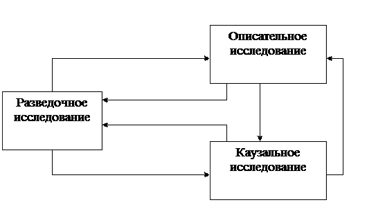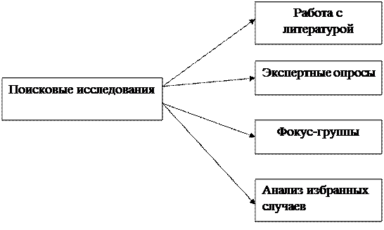 Рис.2.2.1. Взаимосвязь между проектами исследований Поисковые исследования могут быть использованы для того, чтобы установить приоритетность в изучении соперничающих между собой вопросов. Высший приоритет, как правило, будет отдаваться той гипотезе, которая выглядит наиболее многообещающей в процессе поискового исследования. Приоритеты также могут быть расставлены в соответствии с осуществимостью изучения самой гипотезы. Поисковое исследование должно помочь устранить те идеи, которые не являются практическими. Поисковое исследование также используется для увеличения знания исследователя о самой проблеме. Это, в частности, справедливо, когда аналитик выходит на новое для себя поле исследования. На рисунке представлены основные типы поискового исследования.