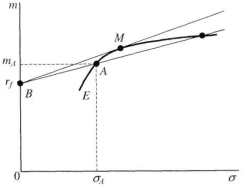, то это означает, что все деньги будут вложены в рисковый актив, ожидаемый доход и стандартное отклонение будут равняться ( Если на этом графике представить каждый возможный рисковый актив с определенной доходностью с помощью параметров Если отметить на границе такую точку М, что ВМ – касательная к границе эффективности, это будет означать, что ВМ – наиболее эффективная бюджетная линия . Для любой точки отрезка АВ можно указать точку отрезка ВМ, лежащую выше нее. В точке касания бюджетной линии и границы эффективности будет достигаться удовлетворение – т. е. оптимальное сочетание безрискового и рискового активов. Такое сочетание называется оптимальной комбинацией рисковых активов, а соответствующий портфель называется рыночным. Наклон бюджетной линии называются рыночной ценой риска. То есть